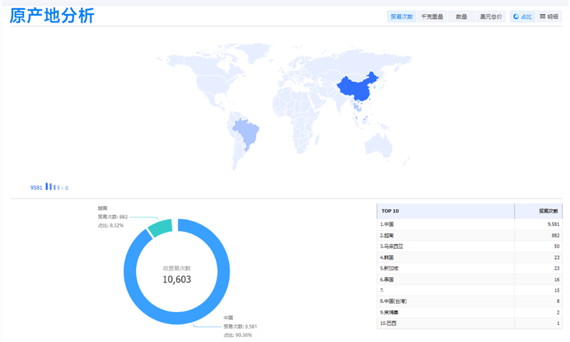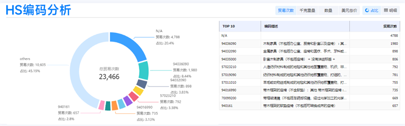 例如,利用【威九国际V9外贸通SaaS平台】查看家具产品的进出口贸易记录,威九国际V9可以比较不同国家/地区的贸易量和贸易额,分析市场的进口和出口情况。
